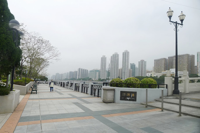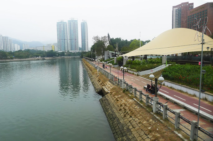 續往毗鄰的奧運牛牛園地,及後進入沙田中央公園遊覽,先到巨型天幕廣場往城門河賞仿古瀝源橋河岸風光,後轉往單邊一隅的南園,遊走南園小徑,步至希爾頓中心出口天橋返回。續環走南園而出進入中央的結客廣場,跨過噴水池後續行接入另一單邊的北園,在園中轉了一圈,順登二米許小山俯瞰全園景致,小巧玲瓏。